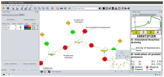 Among the general-purpose network visualization tools, Cytoscape [12] has become prominent as it provides a well-documented API (Application Programming Interface), is open-source and offers an ever increasing number of apps addressing different problems in its app store [13]. In Cytoscape, several applications that aim at handling data exist [14,15]. MetScape [14], which is able to visualize metabolomics and transcriptomics data and is tailored for metabolic networks, or the general enhanced Graphics app [15], which allows the generation of multiple different types of visualization with small scripts. While these tools do allow visualization in an integrated way, they are either restricted in the usable data (e.g., MetScape handles expression or metabolomics data but does not support proteomics or simulated data) or necessitate additional scripting by the user to adjust the visualization (like the enhancedGraphics app).
