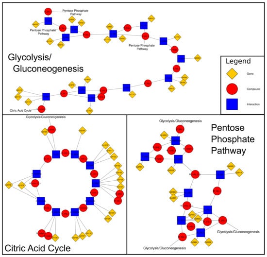 Connected subnetworks for glycolysis/gluconeogenesis, citric acid cycle and the pentose phosphate pathway. The pathways are linked to each other by the linkers (names of the other pathways). Layouts were generated automatically with Cytoscape layout algorithms and scaled/rotated to fit this figure. Gene nodes were added to the network based on the SBML note fields using IDARE2’s SBML annotation tool. Abundant metabolites like water and phosphate along with co-factors like ATP and Coenzyme-A were set to be removed from the network, while NADPH was set not to extend to other pathways.