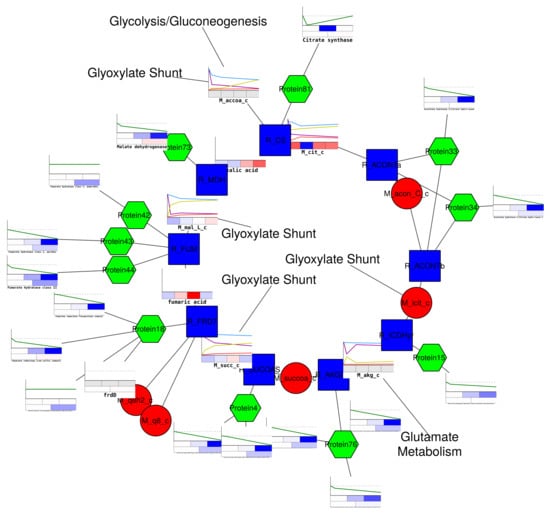 E. coli TCA (tricarboxylic acid cycle) with data mapped from multiple sources. Labeling data suggest usage of the glyoxylate shunt, as alphaketoglutarate is the only metabolite not accumulating labeling. Overall expression and protein levels are lower, but metabolite levels seem to increase upon treatment. Red circles represent metabolites, green hexagons represent proteins formed by the genes accoring to the GPR rules from the sbml. Blue squares represent reactions.