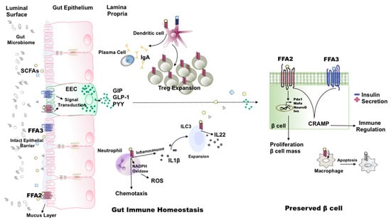 Role of FFA2 and FFA3 in gut immune homeostasis and β cell physiology in the context of T1D. The engagement of FFA2 and FFA3 on gut epithelial and enteroendocrine (EEC) cells by gut microbial metabolites, short-chain fatty acids (SCFAs), regulates epithelial barrier integrity and the secretion of various incretin hormones. FFA2 signaling on various gut immune cells promotes an anti-inflammatory and tolerogenic environment. Neutrophil FFA2 affects chemotaxis, the production of reactive oxygen species (ROS), and IL1β. FFA2 activation on innate lymphoid cell 3 (ILC3) directly and in conjugation with neutrophil-released IL1β promotes IL22 production. FFA2 also promotes ILC3 and regulatory T cell (Treg) expansion. Receptor activation on dendritic cells contributes to B cell (plasma cell) differentiation and IgA release. Altogether, SCFA receptor activity promotes an anti-inflammatory state that, in turn, suppresses the immune destruction of β cells. Factors produced in the gut, such as incretin hormones and SCFAs, and possibly immunosuppressive immune cells such as Tregs, travel to pancreatic β cells, influencing their physiology. In β cells, FFA2 stimulates insulin secretion and proliferation and is essential for the establishment and preservation of β cell mass. FFA3 activation reduces insulin secretion. Both receptors possibly stimulate the production of immunomodulatory cathelicidin-related antimicrobial peptide (CRAMP). FFA2 activation on infiltrating proinflammatory macrophages causes immune cell apoptosis.