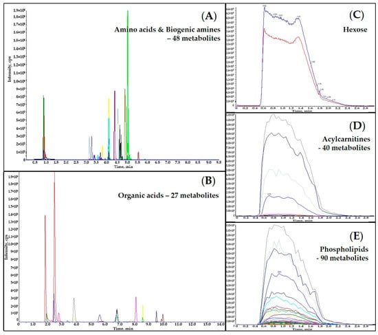 Overlaid representative Extracted Ion Chromatograms (EICs) of analyzed metabolites and ISTDs in an extracted pine needle sample: (A) EICs of amino acids, biogenic amines and their derivatives; (B) EICs of organic acids; (C) EICs of hexose; (D) EICs of acylcarnitines; (E) EICs of phospholipids.