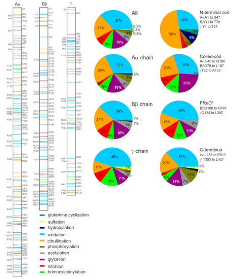 Positions of ten types of PTMs were reported: citrullination (reported in 7 works), followed by oxidation (7), phosphorylation (5), glycation (3), acylation (2; together with glycation), nitration (2), sulfation (2), homocysteinylation (2), hydroxylation (1) and glutamine cyclization (1). Oxidation is the most abundant PTM, affecting 113 AAs (44 in the Aα chain, 40 in the Bβ chain, and 29 in the γ chain). Citrullination is reported for 65 AAs (36/22/7), 46 AAs are glycated (22/17/7), 27 AAs are homocysteinylated (11/6/10), 21 AAs are nitrated (4/11/6), 17 AAs are acetylated (8/7/2), and 3 AAs are sulfated (0/1/2). Phosphorylation (12 AAs; 10/0/2) is recognized only in the Aα chain and in the C-terminal extension of the γ’ chain. The cyclization of BβQ1, the only cyclization known in fibrinogen, is the first PTM discovered in fibrinogen and the first AA cyclization reposted in a protein [49].