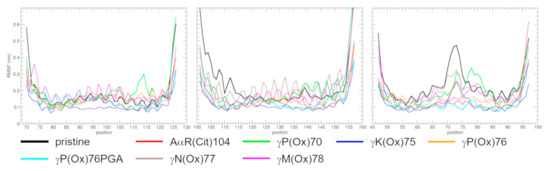 The most prominent feature in the RMSF of the γ chain is a peak centered around γS73. This peak is lower in modified molecules than in pristine fibrinogen, which means that their γ-coil is less flexible. The peak is absent in AαR(Cit)104 and γP(Ox)76PGA. The center of the curve is low for AαM(Ox)78, and its maximum is located at γI79, the N-terminal AA of the C-terminal extension of the γ-coil. γP(Ox)70 also exhibits the irregular shape of the central peak, with a maximum at γM78 and a depression at γK75.