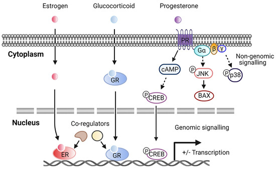 Although steroid hormone receptors are notably nuclear receptors, it has been reported that different steroid receptors in fact exist in extranuclear cellular pools. Steroid hormones may enter cells through the plasma membrane and bind to their receptors localized in the cytoplasm before translocating to the nucleus to regulate the transcription of target genes. In addition, new pathways of steroid hormones signaling through cell surface receptors contribute to more rapid, “non-nuclear”, or non-genomic signaling. Activated steroid receptors in the plasma membrane can stimulate second messenger cascades, interacting with several signaling molecules such as phosphatidylinositol 3-kinase (PI3K)/Akt, Ras/Raf-1, protein kinase A (PKA), and protein kinase C (PKC), leading to cell proliferation [63]. The molecular function of steroid hormones depends on the subcellular distribution of the receptors (Figure 1). Some sex hormone receptors, such as estrogen receptor α and β (ERα, ERβ), are found mainly in the nucleus [64,65]. Glucocorticoid receptors are predominantly localized in the cytoplasm and translocate to the nucleus upon binding to the ligand [66]. Recent evidence has demonstrated that membrane PRs mediate most of the nongenomic signaling of progesterone actions [67]. Progesterone-bound membrane PR potentiates cAMP production and cAMP responsive element-binding protein (CREB)-mediated transcription [68]. Furthermore, the activation of G protein via membrane PR induces the activation of JNK and p38 signaling pathways [67,68]. For novel therapeutic targets under consideration, priority should be given to these steroid receptors in nuclear or plasma membranes.