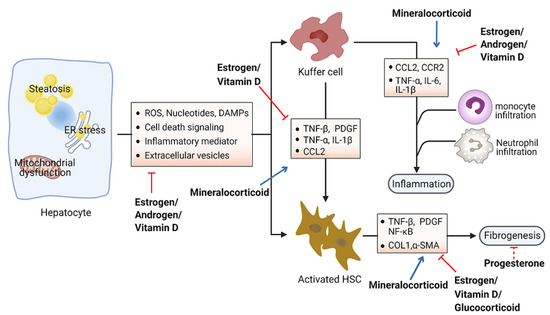 Accumulation of toxic lipids leads to ROS, endoplasmic reticulum (ER) stress, cell death, release of damage-associated molecular patterns (DAMPs), and secretion of inflammatory mediators and extracellular vesicles, which stimulate an inflammatory response in Kupffer cells and a fibrotic response in hepatic stellate cells (HSC) [94,95]. The inflammatory process includes recruitment of macrophages and neutrophils to the site of injured tissue, followed by production of proinflammatory chemokines and cytokines such as interleukin 1 (IL-1) and tumor necrosis factor alpha (TNF-α) [96,97]. Furthermore, initiation of the inflammatory acute-phase response of the liver is induced by these cytokines together with IL-6 [98]. Liver inflammation can lead to fibrosis that may eventually induce cirrhosis [99]. Hepatic fibrosis is characterized by the accumulation of extracellular matrix. As a crucial driver of fibrosis, HSCs can be transdifferentiated into proliferative and fibrogenic myofibroblasts [100]. Profibrogenic cytokines such as vascular endothelial growth factor (VEGF), platelet-derived growth factor (PDGF), and transforming growth factor-β (TGF-β) are involved in the activation of HSCs and hepatic abnormal wound repair response [101,102,103]. Collectively, hepatocellular damage, inflammation, and fibrosis are the main characteristics of NASH [104,105]. Numerous studies have demonstrated the important effects of steroid hormones in the pathological progression of NASH (Figure 3). Here, we summarize steroid hormone-mediated effects on hepatic inflammation and fibrosis in animal models in Table 2.