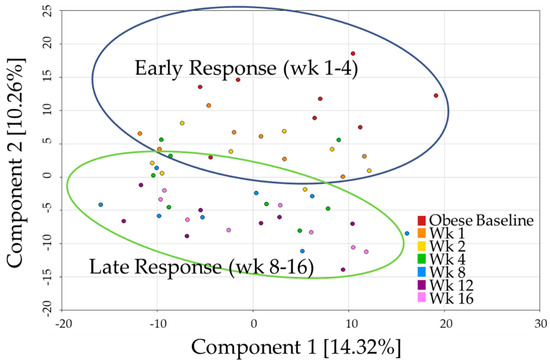 A total of 535 named biochemicals were identified, with up to 269 metabolites being altered (p- and q-values < 0.05) at any time point. Principal component analysis (PCA, Figure 1) showed a continual shift in metabolite profile as weight loss progressed. Components one and two explained 14.3% and 10.3% of the variability, respectively. Although distinct clusters did not form, a biphasic relationship seemed to distinguish the early (wk 1–4) and late (wk 8–16) responses to weight loss. Broadly speaking, wk 1 and 2 appeared similar to baseline, wk 4 was variable, and wk 8, 12, and 16 were more differentiated from baseline. All of the metabolites discussed below were statistically significant with a combined p- and q-value ≤ 0.05.