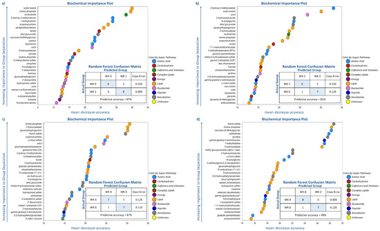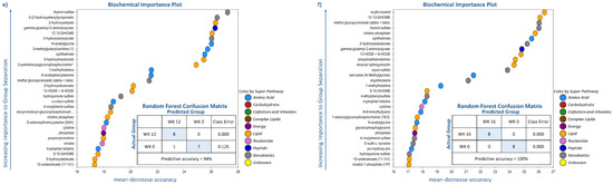 Top 30 serum metabolites that differed in cats and group prediction accuracy at (a) wk 1 versus baseline, (b) wk 2 versus baseline, (c) wk 4 versus baseline, (d) wk 8 versus baseline, (e) wk 12 versus baseline, and (f) wk 16 versus baseline, according to random forest analysis.