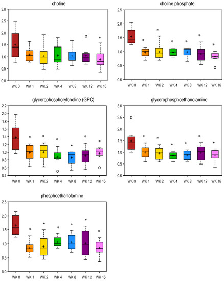 Fold change of metabolites related to phospholipids in cats during weight loss. * mean values were lower in comparison with wk 0 (p < 0.05).