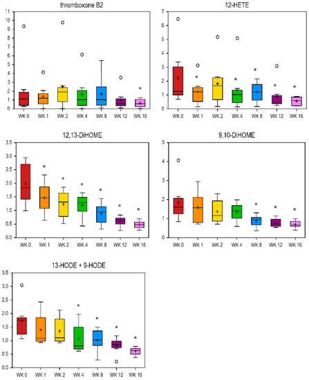 Fold change of metabolites related to eicosanoids and oxidized lipids in cats during weight loss. * mean values were lower in comparison to wk 0 (p < 0.05).