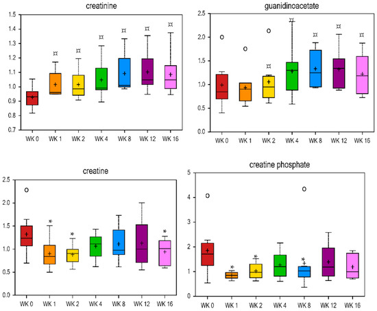 Fold change of metabolites related to creatinine metabolism in cats during weight loss. * mean values were lower in comparison with wk 0 (p < 0.05). ¤ mean values were higher in comparison with wk 0 (p < 0.05).