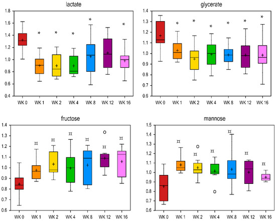 Fold change of metabolites related to carbohydrates in cats during weight loss. * mean values were lower in comparison with wk 0 (p < 0.05). ¤ mean values were higher in comparison with wk 0 (p < 0.05).