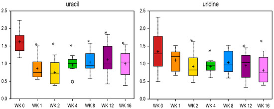 The remaining metabolites altered by reduced food intake and weight loss were related to nucleotide (26 metabolites), xenobiotic (38 metabolites), and cofactor and vitamin (19 metabolites) metabolism (Table 6 and Table 7, Supplementary Table S4). Markers of xanthine- or inosine-containing purine metabolism were decreased, with xanthine, 2′-deoxyinosine, and urate quickly decreasing by wk 1 vs. wk 0 (fold change = 0.48, 0.46, and 0.74, respectively, Table 7). Some markers of pyrimidine metabolism such as uracil (Figure 8), 2′-deoxyuridine, and cytidine were decreased (Table 7), while others such as orotate were increased (Table 6) with weight loss. It has been shown that uridine infusion induced insulin resistance in rats [107] and has been correlated with insulin resistance in hypertensive patients [108]. Results of the current study show lower uridine at wk 2, 4, 12, and 16 vs. wk 0 (fold change = 0.69, 0.68, 0.7, and 0.61, respectively). Uracil forms uridine when it is combined with a sugar ribose by a glycosidic linkage [109]. Uracil was lower at all wk vs. wk 0, with a fold change of 0.53 at wk 1 vs. wk 0 (Figure 8). Most xenobiotics decreased with weight loss. Markers of benzoate metabolism, such as 4-ethylphenylsulfate and 4-vinylphenol sulfate, were lower at wk 1 vs. wk 0 (fold change = 0.41 and 0.49) and continued to decrease with weight loss (Table 7). Similar results were observed in xenobiotics related to food and plant components (i.e., ergothioneine and pyrraline), drugs (i.e., 4-acetylphenol sulfate and hydroquinone sulfate), and chemicals (i.e., O-sulfo-l-tyrosine and ethyl glucuronide), with all being decreased with weight loss (Table 7). Conversely, the chemical-related xenobiotic 2-hydroxyisobutyrate increased with weight loss (fold change = 1.87 at wk 16 vs. wk 0, Table 6).