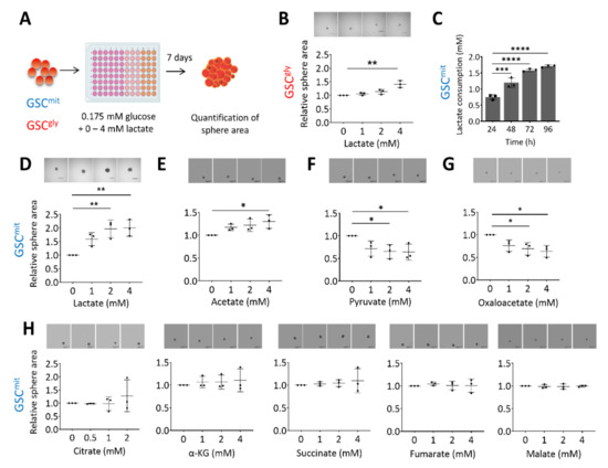 To investigate whether lactate can serve as an additional bioenergetic substrate for GSCs, we first determined the glucose concentration that allowed mouse GSCs to remain viable but unable to proliferate or form spheres. We found this glucose concentration to be 0.175 mM, which corresponds to 1% of the concentration in our standard culture condition. We have previously shown that GSCs can differ in their main energy pathway, and have established two clonal GSC populations, glycolytic GSCs (GSCgly, line GSCA), and oxidative GSCs (GSCmit, line GSCB) [12], as well as a non-clonal population containing predominantly oxidative GSCs (TSH) [12,24]. Here, we first cultured GSCA and GSCB in in a medium containing 0.175 mM glucose (ultralow glucose medium, or ULGM) and various concentrations of lactate (Figure 1A). The rescue effect of lactate on cell growth was small in glycolytic GSCs, even at a concentration of 4 mM (Figure 1B). In contrast, lactate was consumed by oxidative GSCs (Figure 1C) and sustained their growth as spheres (Figure 1D and Supplementary Figure S1A). Acetate has also been identified as a bioenergetic substrate for glioma cells [2,25]. We found that the addition of 4 mM acetate had a significant rescue effect on the growth of oxidative GSC spheres, but this effect was not as prominent as that of equimolar lactate (Figure 1E). Pyruvate is taken up by cells through the same monocarboxylate transporters (MCTs) as is lactate, and it has been shown to serve as an alternative fuel in metastatic breast cancer cells and cultured glioblastoma cell lines [26,27]. We found that the addition of pyruvate to oxidative GSCs did not, however, rescue sphere growth. Indeed, pyruvate had a slight inhibitory effect on GSC growth, as did oxaloacetate (Figure 1F,G). The TCA intermediates citrate, α-ketoglutarate, succinate, fumarate, and malate had no significant effect on sphere growth (Figure 1H).