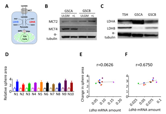 We next investigated the molecular basis of the effect of lactate on sphere growth. The difference in lactate utilization between oxidative versus glycolytic GSCs might have reflected a difference in lactate uptake or intracellular fate (Figure 2A). Consistent with their respective propensities to release [12] or consume (Figure 1B–D) lactate, immunoblot analysis revealed that glycolytic GSCs preferentially expressed MCT4 whereas oxidative GSCs preferentially expressed MCT2 (Figure 2B). Lactate dehydrogenase isozyme B (LDHB) catalyzes the conversion of lactate to pyruvate (Figure 2A), which is necessary to route lactate into subsequent catabolic reactions. Therefore, next we analyzed the expression of LDH isoforms in the glycolytic GSC line (GSCA) and the two oxidative GSC lines (GSCB and TSH). The expression of LDHA was markedly higher in the lactate-producing GSCA cells than in GSCB or TSH cells, whereas LDHB was more abundant in the lactate-consuming GSCB and TSH cells (Figure 2C). To further examine the relation between LDHB expression and lactate utilization, we performed single-cell cloning for the TSH cells and established 10 clonal populations, designated TSH-N1 to TSH-N10. The contribution of lactate to sphere growth was quantified as the lactate-induced change in sphere area for each clone (Figure 2D) and was then plotted against the abundance of Ldha or Ldhb transcripts (Figure 2E,F). A Pearson coefficient of 0.675 was suggestive of a correlation between Ldhb expression and lactate use (Figure 2F). On the basis of these results, we selected TSH-N5 as a representative clonal line for subsequent experiments.