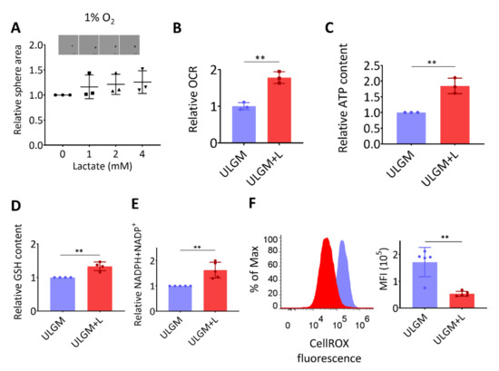Oxygen consumption rate (OCR) was measured with a Seahorse XF Extracellular Flux Analyzer (Agilent Technologies, Santa Clara, CA, USA). Cell plating and measurements were performed as previously described [31]. In brief, cells were incubated in ULGM, ULGM with 4 mM lactate for 24 h. The medium was then changed to glutamine-free Seahorse XF base medium (Agilent Technologies, Santa Clara, CA, USA) supplemented with 0.175 mM glucose with or without 4 mM lactate, and OCR was measured every 10 min for 100 min. The basal OCR recorded 60 min after the initial measurement was compared between groups.