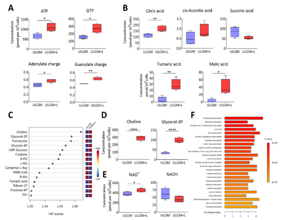 To investigate the extent of the metabolic changes induced by prolonged utilization of lactate in glucose-deprived GSCs, we measured the levels of 116 core intracellular metabolites by capillary electrophoresis (CE) coupled with mass spectrometry (MS) in TSH-N5 cells cultured in ULGM or ULGM supplemented with 4 mM lactate for 6 days. Consistent with the bioenergetic changes apparent after 24 to 72 h (Figure 3B,C), exposure of the cells to lactate for 6 days increased the levels of ATP and GTP as well as the total adenylate or guanylate charge (Figure 4A). Lactate also increased the intracellular levels of citric acid, fumaric acid, and malic acid (Figure 4B,C). Unexpectedly, the VIP (variable importance in projection) scores as determined by partial least squares–discriminant analysis (PLS-DA) were highest for choline and glycerol 3-phosphate (Figure 4C,D), suggestive of a contribution of lactate to lipid synthesis. The NAD+ level was also increased in ULGM cells exposed to lactate (Figure 4E). Furthermore, metabolite set enrichment analysis identified phospholipid biosynthesis as the top differential set (Figure 4F). Together, these results showed that lactate is able to induce reprogramming of catabolic processes and to serve as an alternative bioenergetic substrate in GSCs, and they suggested that it might also make a previously unrecognized contribution to anabolic processes.