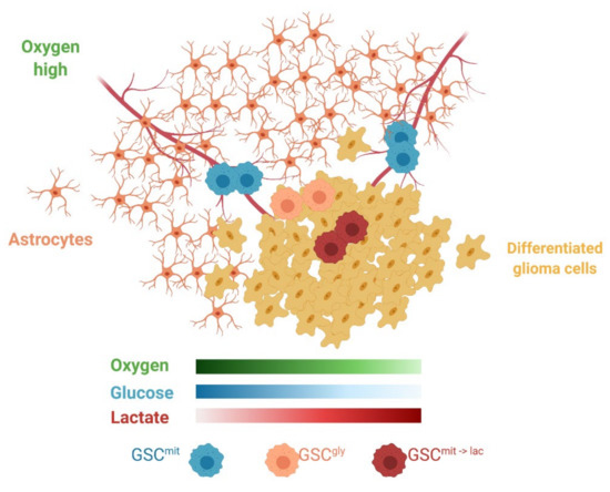 Schematic representation of the heterogeneous microenvironment present in GBM. Astrocytes, GSCgly, and differentiated glioma cells all consume glucose, rely on glycolysis, and release lactate, thus potentially creating areas favorable for GSCmit to switch to lactate as an alternative carbon source (GSCmit->lac) and leading to metabolic cooperation or symbiosis. Created with BioRender.com.