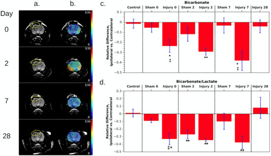 (a) T2-weighted fast spin echo images of a rat following CCI (left hemisphere of the image, indicated by the dotted ellipses). The windowing level was adjusted to emphasize the hyperintense region of injury. (b) The same images with an overlay of the bicarbonate maps. (c,d) Relative difference in metabolites between ipsilateral and contralateral ROIs, averaged over all rats measured at each time point. Individual measurements are shown by black symbols, and each rat has been assigned its own symbol. Also see Table 1 in the methods for the number of rats in each group. All error bars are standard error. Red* indicates that p < 0.05 compared with control animals, ** indicates p < 0.01 compared with controls, and ‡ indicates p < 0.05 compared with shams.