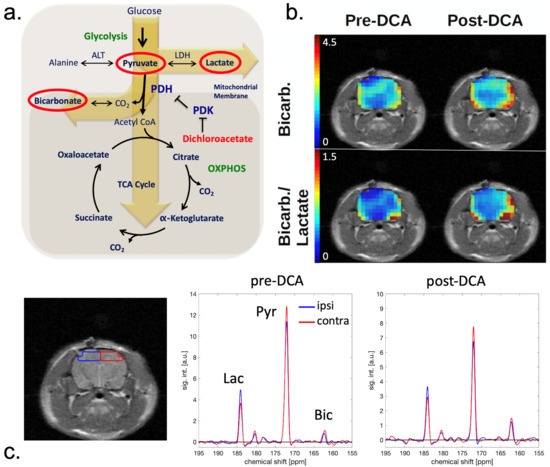 (a) Schematic of the tricarboxylic acid cycle. [1-13C]pyruvate is converted to [1-13C]lactate via lactate dehydrogenase (LDH) and to 13C-bicarbonate via pyruvate dehydrogenase (PDH). PDH is inhibited by pyruvate dehydrogenase kinase (PDK), which in turn is inhibited by dichloroacetate (DCA). The overall effect of DCA is to increase PDH activity. (b) Bicarbonate and bic/lac images of a CCI rat on day 0 before and after DCA administration. The intensity scale is the same for pre- and post-DCA maps. (c) Set of corresponding spectra acquired from ROIs in the ipsilateral (blue) and contralateral (red) hemisphere. The location of the ROIs is indicated on the corresponding MRI (left).