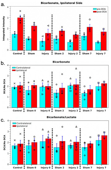 The following are available online at https://www.mdpi.com/article/10.3390/metabo11060335/s1, Figure S1: Longitudinal pyruvate, lactate, and bicarbonate images in a CCI rat before and after DCA administration, The same rat was imaged on days 0 through 28, No DCA was administered on day 0, The intensity scale in the metabolic maps is the same across time points, Figure S2: Longitudinal images of bicarbonate/lactate ratio and lactate/bicarbonate ratio in a CCI rat before and after DCA administration, The same rat was imaged on days 0 through 28, No DCA was administered on day 0, The intensity scale in the ratio maps is the same across time points, Figure S3: Longitudinal set of spectra in a CCI rat from ROIs in the ipsilateral (blue) and contralateral (red) hemisphere, The location of the ROIs is indicated on the corresponding MRIs (left), Spectra are shown both before (middle) and after (right) DCA administration, The same rat was imaged on days 0 through 28, No DCA was administered on day 0, Table S1: Results of Welch’s t-test for four different comparisons of bicarbonate concentration and bicarbonate-to-lactate ratio.