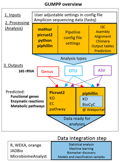 In this study, we introduce a workflow (Figure 1) that integrates Human Microbiome Project tested procedures for amplicon sequence analysis with one of the most popular programs Mothur [34], and PICRUSt2 [27] for prediction of metagenomic functional genes, enzymatic reactions and metabolic pathways. In addition, the workflow presented here generates also formatted inputs for Piphillin [30,31], another popular sister program for metagenomic predictions. The benchmarking of the integrated programs such as Mothur, PICRUSt2, Piphillin and other comparable sister programs were already reported before in numerous studies [16,17,18,19,20,23,27,30,31]. The inbuilt Human Microbiome Project standard operating procedures can be tailored according to user analytical preferences and sequencing details. The whole workflow is delivered as portable all-inclusive container (Singularity [35]; https://sylabs.io accessed on 14 April 2021) amenable for teaching or/and research purposes, using personal computer or HPC. Depending on the size of data and complexity of analyses (genus-, OTU-, ASV- levels), the GUMPP workflow enables maximum utilization of information present in the original 16S rRNA amplicon datasets by producing additional three data types approaching multiomics view of the microbiome: metagenomics functional genes, enzymatic reactions and metabolic pathways. All four data types can serve as inputs for machine learning to unravel novel mechanistic insight into human disease development in relation to microbiome characteristics. To showcase the efficient analyses and utilization of computing resources two datasets describing human (n = 307) and mice gut (n = 365) were used for demonstration purposes.