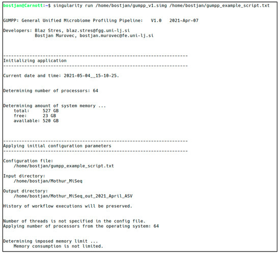 The primary design goal of the GUMPP application was to deliver efficient analyses and utilization of computing resources. The application relies on recently developed Singularity container technology ([35]; https://sylabs.io accessed on 14 April 2021) making the pipeline straightforward to use as all its ingredients are fully integrated, preinstalled and preconfigured in a ready-made Singularity image. These consist of the Mothur and PICRUSt2 programs, the needed Mothur scripts, two Silva taxonomy databases (V138 and V138 seed), a few supporting utilities written in C++, as well as a skeleton framework consisting of slightly less than 11,000 lines of Python code which orchestrates the execution of individual pieces and takes care of executing programs and building their command lines. The actual parameters under which the workflow is executed are at the control of the user (Figure 2, ESM Figures R1–R3).