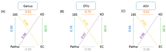 A within level analysis for all derived data types. A schematic representation of GUMPP generated data types analyzed at each of the three levels of 16S rRNA analysis (A) genus, (B) OTU, (C) ASV for the same sequence dataset and extended further to respective predicted functional genes (KO), enzymatic reactions (EC) and metabolic pathways (Pathw). Numbers designate the Mantel test correlation coefficients between various pairs of data types: (i) 16S and functional genes (KO)(orange), (ii) 16S and enzymatic reactions (EC) (yellow), (iii) 16S and metabolic pathways (Pathw) (blue), (iv) pathw and EC (pur-ple), (v) pathw and EC (grey), (vi) KO and EC (green). All analyses were performed with 9999 permutations and were statistically significant (p = 0.0001).
