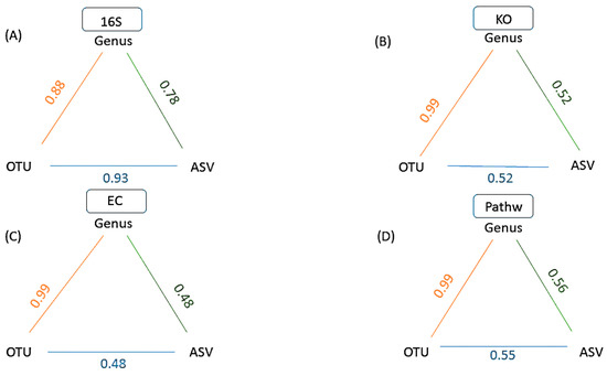 A schematic representation of GUMPP results showing a between level correlations for each data type: (A)16S rRNA (16S), (B) functional genes (KO), (C) enzymatic reactions (EC) and (D) metabolic pathways (Pathw). Numbers designate the Mantel test correlation coefficients between various pairs of levels for the same data type: (i) Genus and OTU (orange), (ii) OTU and ASV (blue), (iii) Genus and ASV (green). All analyses were performed with 9999 permutations and were statistically significant (p = 0.0001).