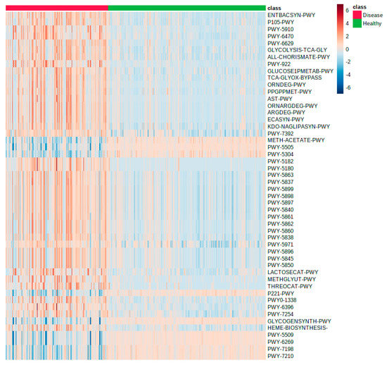 Heatmap showing the differences between the gastrointestinal patients (n = 121; red) from a single ward compared to 186 healthy volunteers (green) utilizing metabolic pathway information produced by GUMPP workflow from 16S rRNA data published before [45,59]. The first 50 most informative pathways are shown.