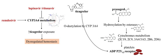 In this last year, researchers have directed a big commitment towards the study of drugs for the treatment of COVID-19 that may have interfered with oral antiplatelet drugs in oxidative processes at the level of hepatic cytochrome P450 (CYP) enzymes. The consequence is that the action of many antiviral drugs affects platelet metabolism. For example, the administration of lopinavir or ritonavir, protease inhibitors acting on CYP3A4 metabolism, may result in the inhibition of platelet activity at the level of CYP3A4 metabolism. As the active metabolite of clopidogrel is formed mainly by oxidation in CYP2C19, it leads to a reduction in the effective dose of clopidogrel. Instead, the oxidative process leading to the active ticagrelor metabolite occurs in CYP3A4 which is inhibited by lopinavir and ritonavir. The result is an increase in the effect of ticagrelor [42,43,44,45] (Figure 1).