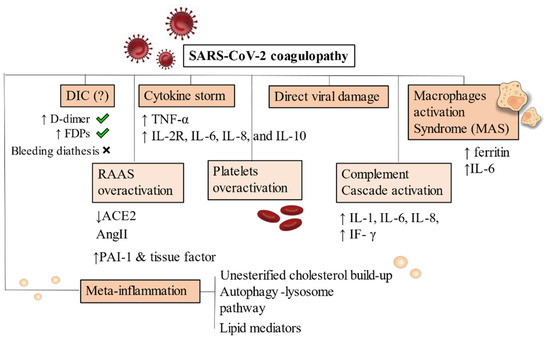 As a consequence of dysregulated immune reactions, hypercoagulable states are established due to continued inflammation. Macrophages activation syndrome (MAS) and cytokines released play major roles by activating a pro-inflammatory cascade [112,113] (Figure 2).
