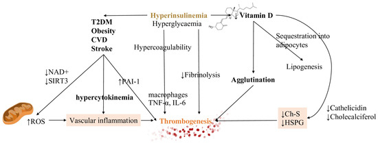 Vitamin D hydroxylation requires magnesium which is notably depleted in hyperinsulinemic conditions. Other mechanisms responsible for decreased Vitamin D levels are increased renal excretion, reduced intracellular levels, and sequestration into adipocytes. The last process is related to lipogenesis which is already increased in hyperinsulinemic patients [128]. Consequences of reduced activation are decreased levels of cholesterol sulfate (Ch-S), heparan sulfate proteoglycans (HSPG), and cathelicidin synthesis. The final result is the promotion of agglutination and, subsequently, of thrombosis. An explanation for this can be found in the action of HSPGs as potent anticoagulant molecules which also buffer glycation damage. Ch-S is instead implicated in RBCs shape deformation for traveling through vascular spaces of reduced caliber [128,129,130].