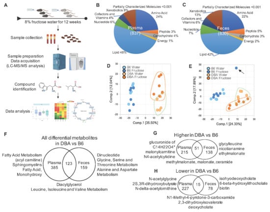 Metabolomic profiles in plasma and feces of DBA and B6 mice. (A) Schematic study design. (B,C) Distribution of plasma (B) and fecal (C) metabolites within nine major metabolic pathways. The numbers shown in parentheses are the total metabolites we have identified in plasma (B) and feces (C). (D,E) Principal component analysis (PCA) plot assessing the variance of metabolites between B6 water group, B6 fructose group, DBA water group, and DBA fructose group in the plasma (D) and feces (E). The percentages of variance explained by the first (Comp. 1) and second (Comp. 2) principal components are shown in brackets. The arrow in (E) indicates an outlier detected, which was removed from subsequent analyses. (F–H) Venn diagrams showing the numbers of all differential (F), higher (G), or lower (H) metabolites in DBA compared with B6 without fructose consumption. We further compared these differential metabolites between plasma and feces to infer differential metabolites potentially originated from the gut microbiota. Top representative pathways are shown in (F), which are similar for the higher and lower metabolites in (G,H). Therefore, top differential metabolites instead of pathways were shown in (G,H). n = 5–6/group/mouse strain. Differentially abundant baseline metabolites in DBA compared with B6 were determined by ANOVA contrasts (q < 0.05). Symbol (*) next to metabolite indicates that the compounds have not been officially confirmed based on a standard, but that we are confident in its identity.
