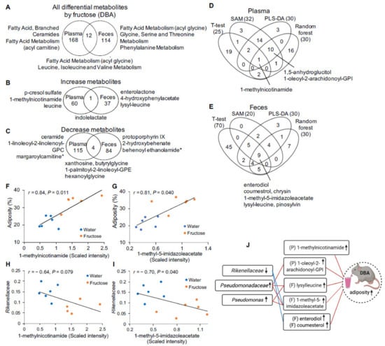 Fructose-responsive metabolites in plasma and feces of DBA mice. (A) Venn diagram showing the number of fructose-responsive metabolites and the representative pathways that were overlapping or unique between plasma and feces in DBA mice. (B,C) Venn diagram showing the number of the increased (B) and decreased (C) metabolites by fructose and the top metabolites that were overlapping or unique between plasma and feces in DBA mice. (D,E) Venn diagrams representing overlapping significant metabolites altered by fructose in plasma (D) and feces (E) across four statistical methods: statistical significance (t-test/fold change), Significance Analysis of Metabolites (SAM), Partial-least squares discriminant analysis (PLS-DA), and Random forest. (F–I) Correlation plots of metabolites with the adiposity phenotype (F,G) and fructose-responsive microbiota (proportion, 0–1) (H,I) in DBA mice with and without fructose treatment. r, Biweight midcorrelation (bicor) coefficient; P, Benjamini-Hochberg adjusted p-values (FDR). (J) Summary of the correlation between fructose-responsive microbiota, metabolites, and metabolic phenotype (adiposity) of DBA mice. Increased or decreased levels of microbiota, metabolites, and metabolic phenotype (adiposity) upon fructose consumption were indicated by up or down arrows, respectively. P, plasma; F, feces. n = 5–6/group/strain. Fructose-responsive metabolites were determined by ANOVA contrasts (p < 0.05). Symbol (*) next to metabolite indicates that the compounds have not been officially confirmed based on a standard, but that we are confident in its identity.