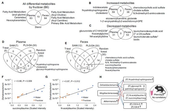 Fructose-responsive metabolites in plasma and feces of B6 mice. (A) Venn diagram showing the number of fructose-responsive metabolites and the representative top pathways that were overlapping or unique between plasma and feces of B6 mice. (B,C) Venn diagrams showing the number of the increased (B) and decreased (C) metabolites by fructose and the top metabolites that were overlapping or unique between plasma and feces of B6 mice. (D,E) Venn diagrams representing overlapping significant metabolites altered by fructose in plasma (D) and feces (E) across four statistical methods: statistical significance level (t-test/fold change), Significance analysis of metabolites (SAM), Partial-least squares discriminant analysis (PLS-DA), and Random forest. (F,G) Correlation plots between metabolites and fructose-responsive microbiota (proportion, 0–1) of B6 mice with or without fructose treatment. r, Biweight midcorrelation (bicor) coefficient; P, Benjamini-Hochberg adjusted p-values. (H) Summary of the correlative relationships between fructose-responsive microbiota, metabolites, and metabolic phenotype of B6 mice. Increased or decreased microbiota, metabolites, and metabolic phenotype upon fructose consumption were indicated by up or down arrows, respectively. CDCA-S, chenodeoxycholic acid sulfate; CA-S, cholate sulfate; P, plasma; F, feces. n = 5–6/group/strain. Fructose-responsive metabolites were determined by ANOVA contrasts (p < 0.05). Symbol (*) next to metabolites indicates that the compounds have not been officially confirmed based on a standard, but confident in its identity.