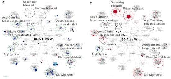 Plasma lipid pathways and metabolites altered by fructose consumption in DBA (A) and B6 mice (B). Dotted circles are lipid sub-pathways with contrasts between DBA and B6. Circles with red, green, black color indicate overall pathway level increase, decrease, or no change by fructose, respectively. Red and blue dots indicate lipid metabolites upregulated and downregulated at p < 0.05, respectively, in fructose-treated mice compared with controls. Pink and cyan dots indicate lipid metabolites upregulated and downregulated at 0.05 < p < 0.1, respectively. Dot size indicates the relative magnitude of change. n = 5–6/group. Statistical significance was determined by ANOVA contrast.