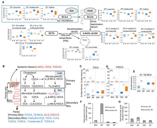 Strain-specific metabolic pathways altered by fructose consumption between DBA and B6 mice. (A) Alterations in BCAA and BCFA metabolism pathways in DBA mice. Box plots show the levels of relevant plasma or fecal metabolites in water and fructose groups of DBA mice. BCAA, branched chain amino acid; BCFA, branched chain fatty acid; BCAT, branched chain aminotransferase; BCKD, branched-chain α-ketoacid dehydrogenase complex; FAS, fatty acid synthase, TCA, tricarboxylic acid cycle. (B) Schematic representation of enterohepatic circulation of bile acids and differentially altered bile acids in the plasma or feces of B6 mice. Blue or red colored bile acids are the decreased or increased bile acids by fructose consumption in B6 mice, respectively. G, glycine-conjugated species; T, taurine-conjugated species; S, sulfated species; CA, cholic acid; CDCA, chenodeoxycholic acid; MCA, muricholic acids; UDCA, ursodeoxycholic acid; DCA, deoxy cholic acid; LCA, lithocholic acid; HDCA, hyodeoxycholic acid. (C–E) Box plots of select secondary (C,D) and primary (E) bile acids in plasma (upper panels of C,D) and feces (lower panels of C–E) of B6 and DBA treated by regular water or fructose water. Total bile acid in plasma (F) and feces (G). n = 5–6/group. Statistical significance was determined by ANOVA contrast (* p < 0.05, ** p < 0.01). NS indicates non-significant difference. BW, B6 water group; BF, B6 fructose group; DW, DBA water group; DF, DBA fructose group; P, plasma; F, feces. Symbol (#) next to metabolite indicates the compound has not been officially confirmed based on a standard, but confident in its identity.