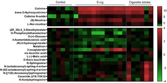 Metabolites from plasma were analyzed from UPLC-MS, metabolite fold changes were analyzed based on the normalized spectrum area. Heatmap representing significant dysregulated metabolites from nicotine degradation, TCA cycle, and sphingolipid metabolism among control (n = 6), e-cig (n = 12), and cigarette smoke (n = 6). Data are summarized as normalized log2 transformed.