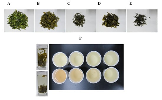Morphologies of Dendrobium catenatum leaves are shown after exposure to various manufacturing processes: (A) freeze drying, (B) hot-air drying at 80 °C, (C) rolling before drying at 80 °C, (D) steaming before drying at 80 °C, and (E) steaming and rolling before drying at 80 °C. (F) Teas were brewed in hot water (85 ± 5 °C). The upper panel show teas made from leaves dried with hot air at 100 °C; the lower panel shows teas made with leaves dried at 100 °C after rolling.