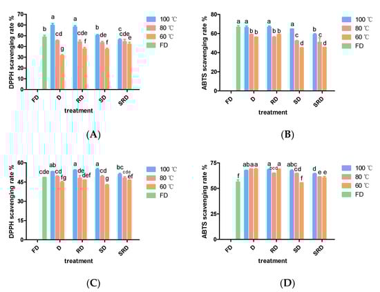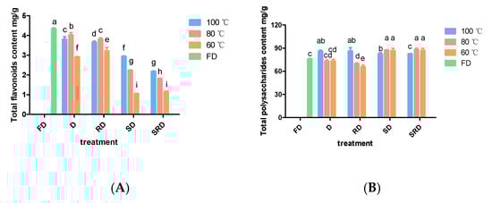 At equivalent drying temperatures, the levels of total flavonoid content decreased as follows: D > RD > SD > SRD (Figure 3A). Drying at 60 °C resulted in the lowest flavonoid yield. Drying D and RD leaves at 80 °C yielded more flavonoids compared with drying at 100 °C; for SD and SRD leaves, drying at 100 °C provided more flavonoids compared with drying at 80 °C; in addition, drying at 80 °C produced more flavonoids than drying at 60 °C. Pretreatments involving steaming presumably accelerated the deterioration of flavonoids. FD samples contained significantly (p < 0.05) greater amounts of total flavonoids compared with other samples.