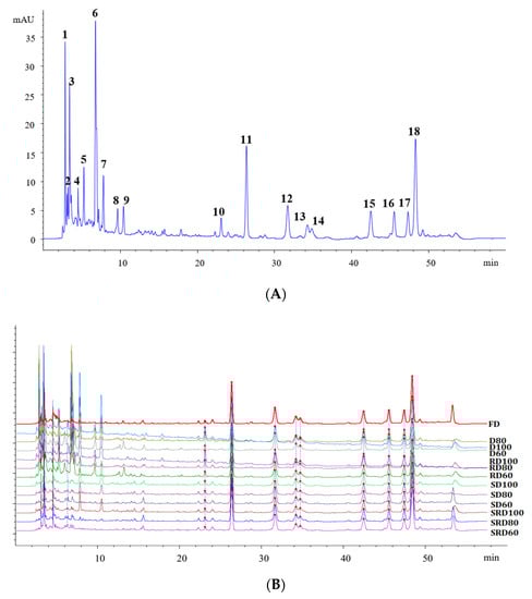 Extracts of D. catenatum leaves contained abundant phenolic components. Following optimization of the separation conditions, more than 50 peaks were resolved in the HPLC chromatogram (Figure 4). Among these, 18 peaks corresponded to characteristic components (Figure 4A). Similarities among all samples were analyzed using the Similarity Evaluation System for Chromatographic Fingerprint of Traditional Chinese Medicine (Version 2004A). Samples D100, D80, D60, RD100, RD80, and RD60 exhibited low similarity (from 0.717 to 0.863); samples SD100, SD80, SD60, SRD100, SRD80, SRD60, and FD showed high similarity (>0.94, Supplementary Table S1). As shown in Figure 4B, the height of D and RD samples’ chromatographic peaks at 2~11 min was obviously higher than others, which indicated that different drying processes affect the content of macropolar metabolites. Notably, the metabolite profiles were similar for steamed samples and FD samples, while rolling had little effect on chemical composition. However, these similarity analyses were unable to effectively differentiate samples that had undergone different treatment processes.