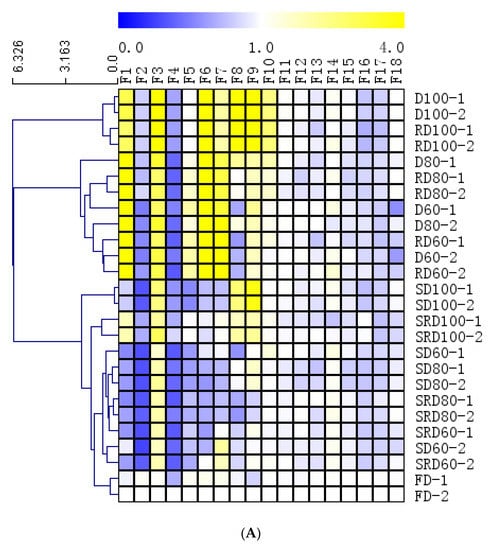 Three major HCA clusters were evident (Figure 5A). The first cluster was composed of D and RD samples that had been dried at 100 °C. The second cluster contained D and RD samples that had been dried at 80 °C and 60 °C. The third cluster contained all steamed samples and the FD samples. The high content of F1, F3, F6, and F7 (at retention times of 2.9, 3.4, 6.8, and 7.8 min, respectively) in clusters I and II clearly differentiated these samples from the other samples.