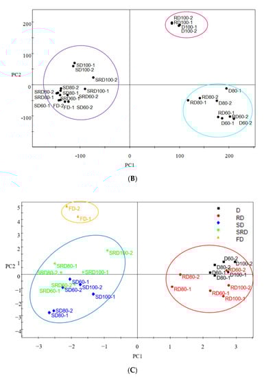Therefore, in the current study, we compared five distinct drying processes on the leaves of D. catenatum: freeze drying (FD), hot-air drying (D), rolling before drying (RD), steaming before drying (SD), and steaming and rolling before drying (SRD). Drying was performed at 100, 80, or 60 °C. Since flavonoids and polysaccharides are the main components in leaves [7,9,21], their content was determined by colorimetric method for each sample. In addition, changes in the scavenging rates of 2,2-diphenyl-1-picrylhydrazyl (DPPH) and 2,2′-azino-bis(3-ethylbenzothiazoline-6-sulfonic acid) diammonium salt (ABTS+) were measured. Furthermore, metabolite profiles were constructed using high-performance liquid chromatography (HPLC) fingerprints and HPLC–electrospray ionization (ESI)–multistage mass spectrometry (MS)n methods combined with multivariate statistical analyses, including hierarchical cluster analysis (HCA) and partial least squares discriminate analysis (PLS-DA).