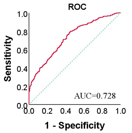 As shown in Figure 1 (left), exhaled NO has a skewed distribution, so we show the results as the median (25% and 75%) of exhaled NO concentration. The number of H with exhaled NO < 20 ppb was significantly higher than that of LC. The number of H decreased significantly with increasing exhaled NO level, eventually becoming lower than the number of LC. The highest level of exhaled NO in H was below 60 ppb, and the highest in LC was above 100 ppb. As shown in Figure 1 (right), the median exhaled NO level of the 284 H was 19.0 (11.4, 30.1) ppb, whereas the median level of the 456 LC was 32.0 (21.8, 44.8) ppb. The mean level of exhaled NO from LC was higher than that from H (LC: 34.1 ± 17.2 ppb, H: 21.0 ± 12.1 ppb, according to Mann–Whitney U-test: p-value < 0.01). The area under the curve (AUC) for predicting the lung cancer and healthy control groups was 0.728 (the 95% confidence interval was 0.692 to 0.765), the sensitivity was 0.798 (the 95% confidence interval was 0.758 to 0.834), and the specificity was 0.55 (the 95% confidence interval was 0.490 to 0.608) (Figure 2).