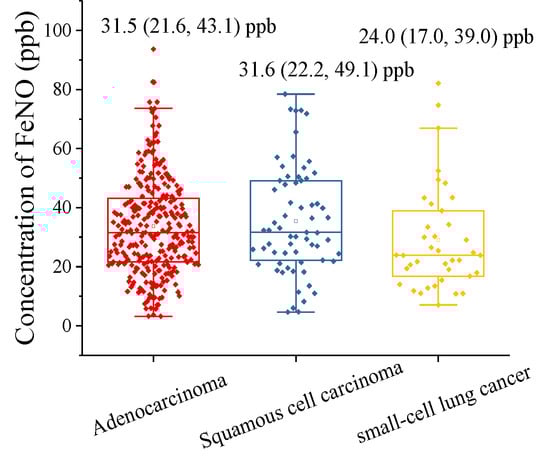 - Liu, P.F.; Zhao, D.H.; Qi, Y.; Wang, J.G.; Zhao, M.; Xiao, K.; Xie, L.X. The clinical value of exhaled nitric oxide in patients with lung cancer. Clin. Respir. J. 2018, 12, 23–30. [Google Scholar] [CrossRef] [PubMed]