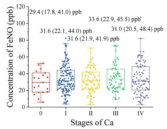 Lung cancer diagnosis also requires determination of the extent of the tumor to define the TNM stage, which will ultimately guide cancer treatment options. Some scholars believe that tumor pathogenesis is related to excessive or inappropriate production of NO [,]. NO in the human body is a kind of active free radical with extensive and multiple effects. NO can exhibit either tumor promotion or antitumor activity: a continuous low concentration of NO can promote tumor growth, whereas a high concentration of NO has an antitumor effect [,,]. Therefore, the exhaled NO levels in different stages of lung cancer are presented in Table 3. The exhaled NO level was highest in stage III LC and lowest in stage 0 (carcinoma in situ) LC (stage 0, 29.4 (17.8, 41.0) ppb; stage I, 31.6 (22.1, 44.0) ppb; stage II, 31.6 (21.9, 41.9) ppb; stage III, 33.6 (22.9, 45.5) ppb; and stage IV, 31.0 (20.5, 48.4) ppb). It can be seen from the scatter and bar chart (Figure 4) that early stage (stage I) lung cancer was significantly more common in the concurrent group, and the level of exhaled NO in each group was as follows: stage 0, 5.9–52.3 ppb; stage I, 3.72–82.4 ppb; stage II, 3.2–70.6 ppb; stage III, 9.2–93.7 ppb; and stage IV, 3.3–107.5 ppb.