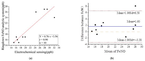 Several laser-based spectral techniques for detecting exhaled NO have been reported [,,,,,,,,,,]. The wavelengths used are all mid-infrared near 5.2 μm (ranging from 5.1 to 5.7 μm). In this spectral range, several other gases, such as CO2 and H2O, also create absorption bands. In addition, according to the HITRAN database, the strongest intermediate infrared absorption cross-section is 3.89 × 10−19 cm2/molecule. Compared with this vibrational band, the electronic transition of NO in the ultraviolet region near 226 nm has a higher absorption strength and cross-section. The UV region near 226 nm is higher, which corresponds to the electron transition. The absorption cross-section near 226 nm is 1.87 × 10−18 cm2/molecule, four times higher than that of 5.2 μm []. This shows that 226 nm can improve the detection sensitivity of NO. In addition, water does not interfere with the measurement of NO at 226 nm, which indicates that 226 nm is more advantageous than 5.2 μm. Recently, we constructed a ringdown exhaled NO analytic system with 226 nm wavelength as laser source. And we verified the measurement accuracy of this CRDS exhaled NO analyzer by comparing with an electrochemical sensor in General Hospital of Tianjin Medical University. The results showed significant correlation between these two methods, with a concordance correlation coefficient of 0.90 (p-value < 0.05, Figure 5, left). As shown in Figure 5 (right), the agreement between the concentration of exhaled NO of the two methods was assessed by using the Bland–Altman analysis, which illustrated good consistency. Comparison of the testing results shows that this ringdown breath acetone analyzer can be used for reliable online, real-time clinic testing. The overall structure, working principle and system performance of the experimental device are described in detail in our previous work [], and this device has been previously validated and demonstrated to be reliable and advantageous. The system has a lower detection limit of 7.4 ppb, and the baseline stability of the system is 0.52%, with good repeatability, stability and real-time performance. The linear response of the CRDS system (R = 0.988) and the accuracy of the dual wavelength background differential method were verified by using a mixture of human respiratory gas and standard NO gas. This work marks the first time CRDS was used for a lung-cancer study.