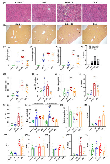 Figure 1. OCA attenuates hepatic steatosis, inflammatory responses and fibrosis in DIO-CCl4 mice. (A) Representative Hematoxylin and eosin (HE) staining results (magnification ×200). (B) Representative Sirius red staining results (magnification ×50). (CF) Histological assessment of steatosis score, ballooning score, inflammation score and the NAFLD activity score (NAS). (G) Quantification of Sirius Red-positive area. (H) Liver TG was detected. (IK) The serum TG concentration, ALT and AST was measured. (L) Body weight and (M) liver/body ratio. (NS) Gene expression assessment of cyclin D1, CDK1, CDK2, CDK4, Col-1a1 and MCP-1 in livers. * p < 0.05, ** p < 0.01, *** p < 0.005 and **** p < 0.001 vs. DIO-CCl4 group; # p < 0.05, ## p < 0.01, ### p < 0.005 and #### p < 0.001 vs. Control group.