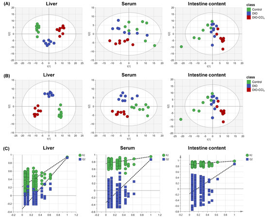 Figure 2. The metabolomic analysis of liver, serum and intestine content. (A) PCA score plots of liver, serum and intestine content. (B) PLS-DA score plots of liver, serum and intestine content. (C) Model validation using a permutation test with 200 cycles of liver, serum and intestine content.