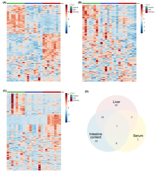 Figure 3. The metabolomic analysis of liver, serum and intestine content. Heatmaps of metabolic characteristics of liver (A), serum (B) and intestine content (C). (D) Venn plot of differential metabolites (The number means the shared differential metabolites).